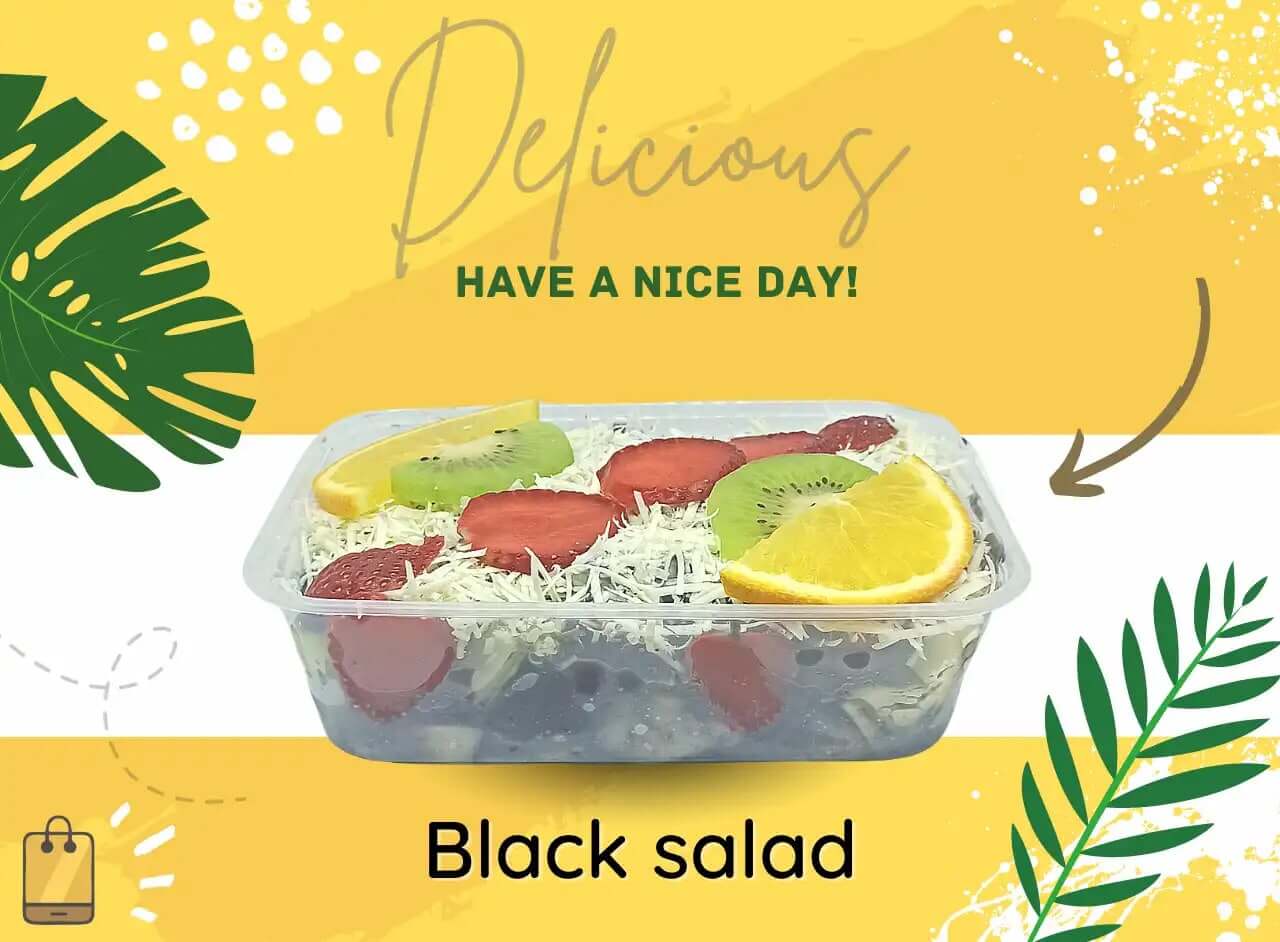 Salad buah terfavorit dengan kuah black activated charcoal yang banyak sekali manfaat, diantaranya: mampu menyerap racun, menyembuhkan masuk angin, dan membersihkan saluran pencernaan.